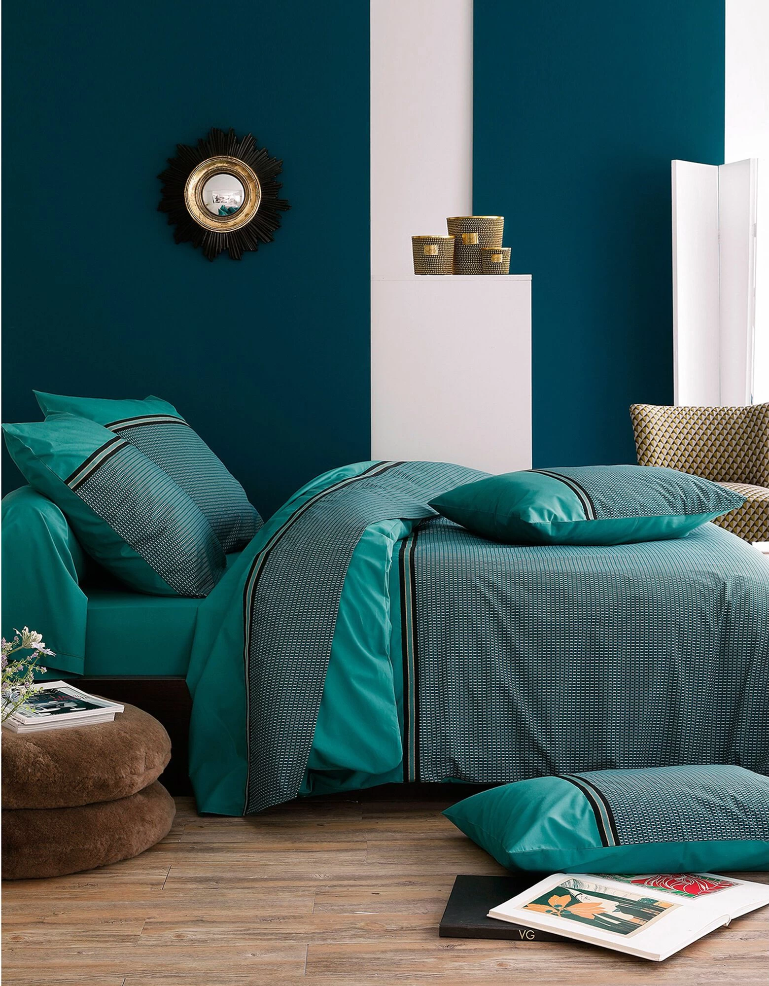– Drap-housse uni coordonné : coins bien emboîtants (bonnet 30 cm). Existe en grande taille (160×200 cm).