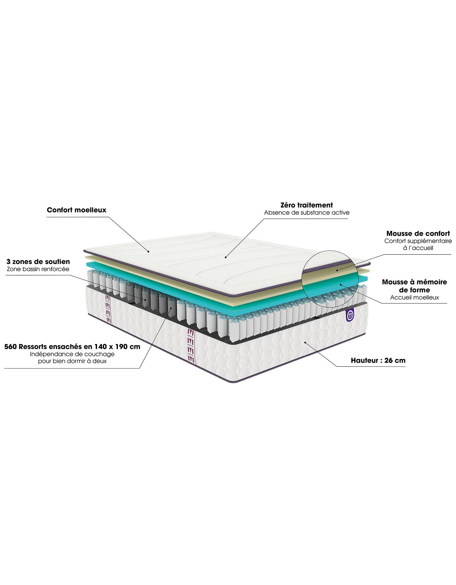 – Âme : 560 ressorts ensachés isolés par 2 cm de mousse à mémoire de forme sur chaque face, pour un couchage indépendant et plus de confort
